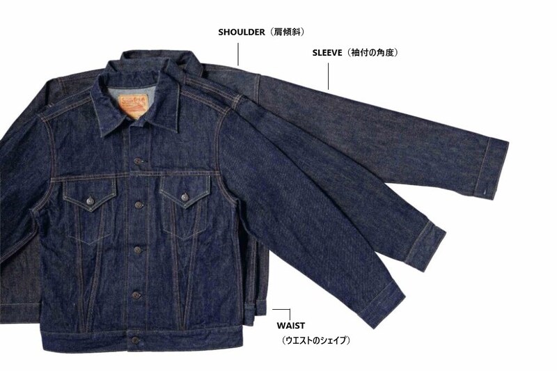 写真奥側から手前に向かって、1st、2nd、3rdタイプ。それぞれのパターンの違いを比較してみよう。3つを重ねてみると一目瞭然。労働着からファッションのためのウエアとしての変化が見てとれる。3rdに向かうにつれて袖や肩の傾斜がより強くなり、ウエストも1stに比べて3rdはジャストサイズで着る必要性が高まったため、3rdの方が細身になっている。