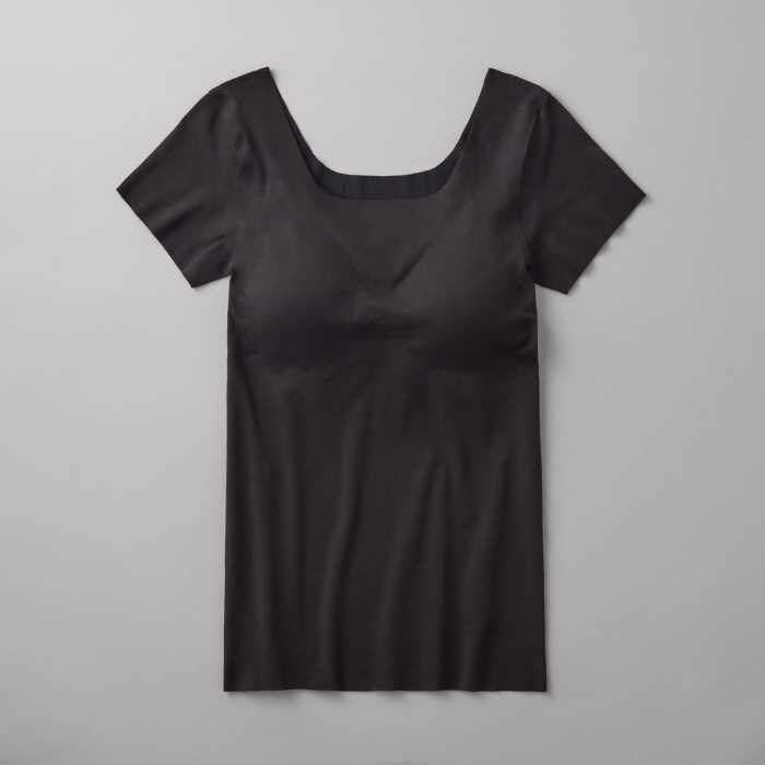 カップ付き2分袖インナーは価格2,860円。サイズはM・L・LLで、カラーはブラック・ノーブルスカイ・グレースベージです。脇や肩まわりをやさしくカバーしながら快適に着用できます。