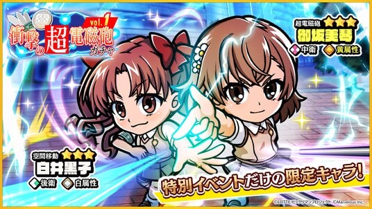新たな☆3キャラクター「[超電磁砲]御坂美琴」「[空間移動]白井黒子」が登場する、「衝撃の超電磁砲ガチャ Vol.1」を開始いたしました。