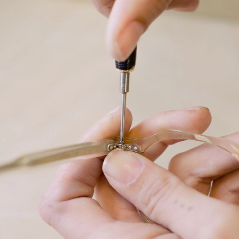 いわゆる“飾り”ではなく、その裏面に位置する蝶番をカシメる機能的な役割を果たす意匠であり、蝶番の破損時に修理しやすいという利点もある。「建築物と同じように、メガネも一生使えるものであるべきで、フレームは修理され、レンズは必要に応じて交換されるべきである」というブランド理念を体現するディテールだ。