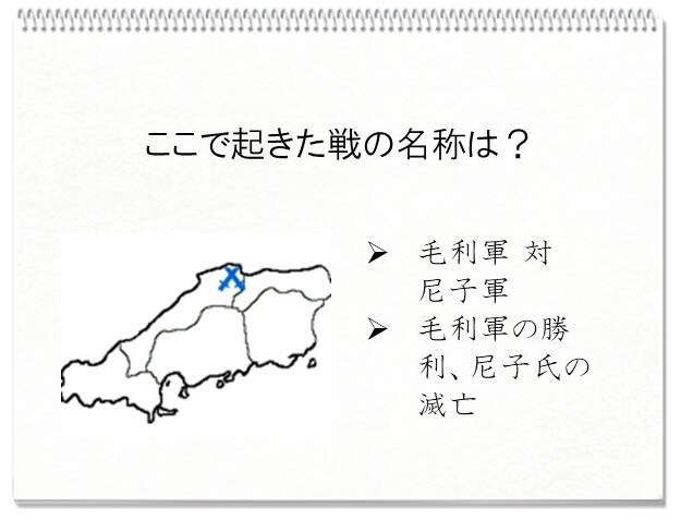 【答】 月山富田城の戦い(がっさんとだじょうのたたかい)周防の大内氏を滅ぼし、中国地方で台頭した毛利元就は、石見銀山を巡って出雲の尼子氏と対立。毛利軍は月山富田城を兵糧攻めにして尼子氏を滅ぼし、中国地方最大の戦国大名となりました。