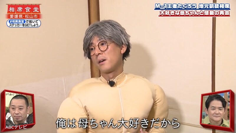 女手一つで大変でも、母親はきむらを愛して定期的に手紙を書いていたという。きむらは、たくろうがM-1王者になってから書いたという手紙を母親からもらうと、「ありがとう。俺は母ちゃん大好きだから」と、シュールすぎるマッチョ着ぐるみと白髪カツラ姿で感謝した。