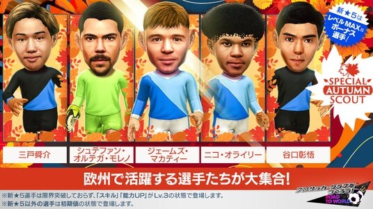 「ジェームズ・マカティー」「シュテファン・オルテガ・モレノ」「ニコ・オライリー」「三戸舜介」「谷口彰悟」が、新★5選手として「レベルMAX(Lv.50)/覚醒2段階達成/各スキル・各能力UP Lv.3達成」の即戦力で登場する“SPECIAL AUTUMN SCOUT”を開催します。