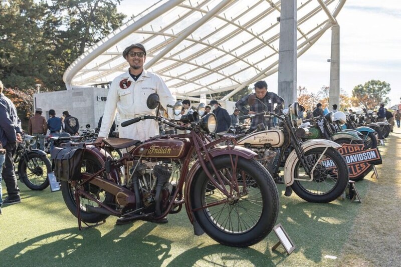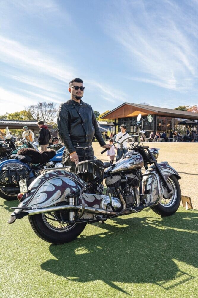リーフスプリングフォークを備えるオリジナルルックのチーフに乗る、旧車専科グッディモーターサイクル代表の木村さん。戦前チーフ自体珍しいが、この車体は元々スティーブ・マックイーンがコレクションしていた超貴重なヒストリー付き。木村さんの手で綺麗にレストアされた。
