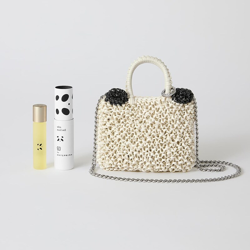 「アンテプリマ」と「ウカ」が初のコラボレーション! 「アンテプリマ」のワイヤーバッグ、「ウカ」のネイルオイルという両ブランドのアイコニックなアイテムが、パンダをモチーフにした大人かわいいデザインで登場します。