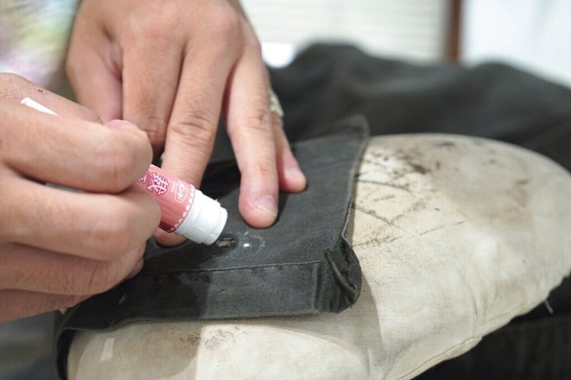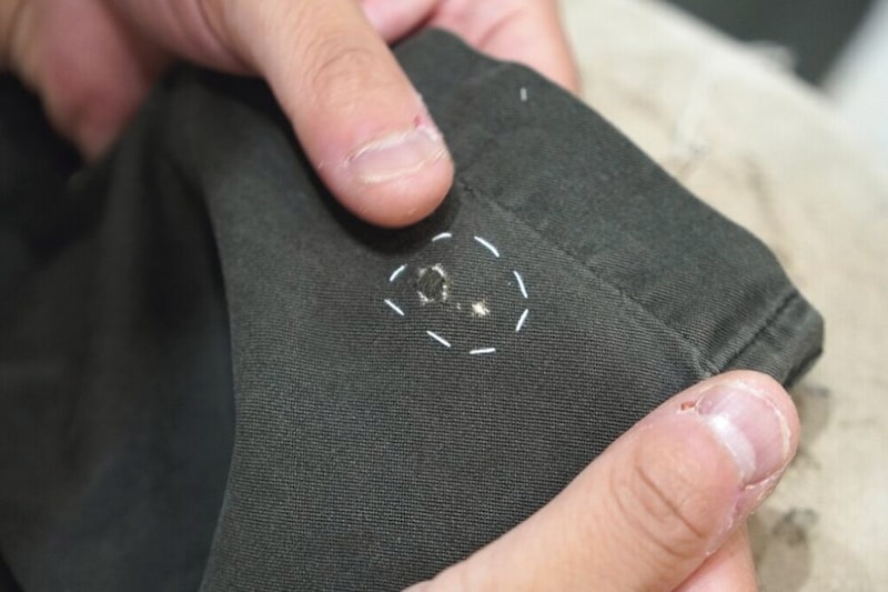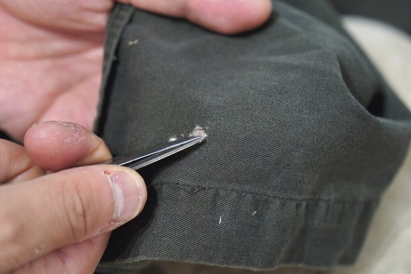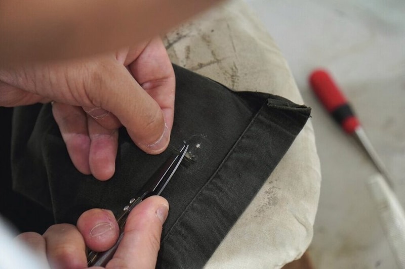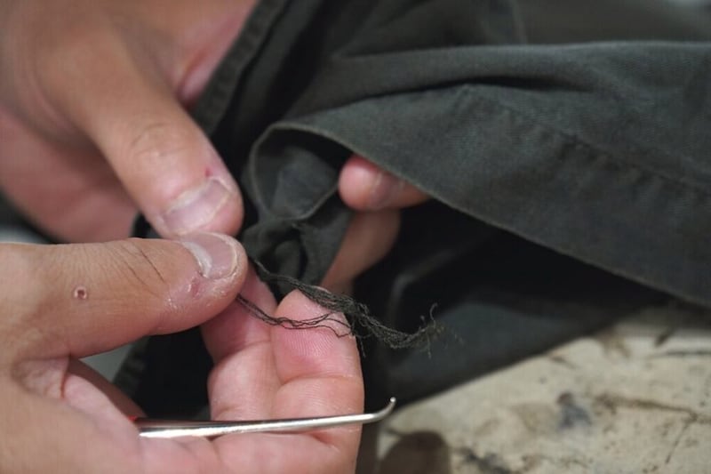 糸を足すために、シャツの前立ての裏など表からは見えない場所から糸を取る。対象が古着の場合綺麗すぎる糸は逆に目立つため注意が必要。