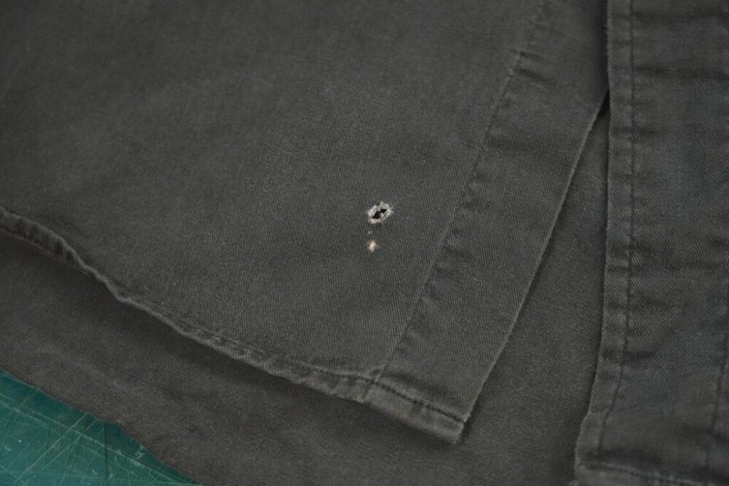 痛みによってできた穴なのか、小さいながらも色が抜けており、存在感のある小穴になってしまった。こうした場合は、シャツの生地から糸を取り、足し織り込むように直せば万事解決。