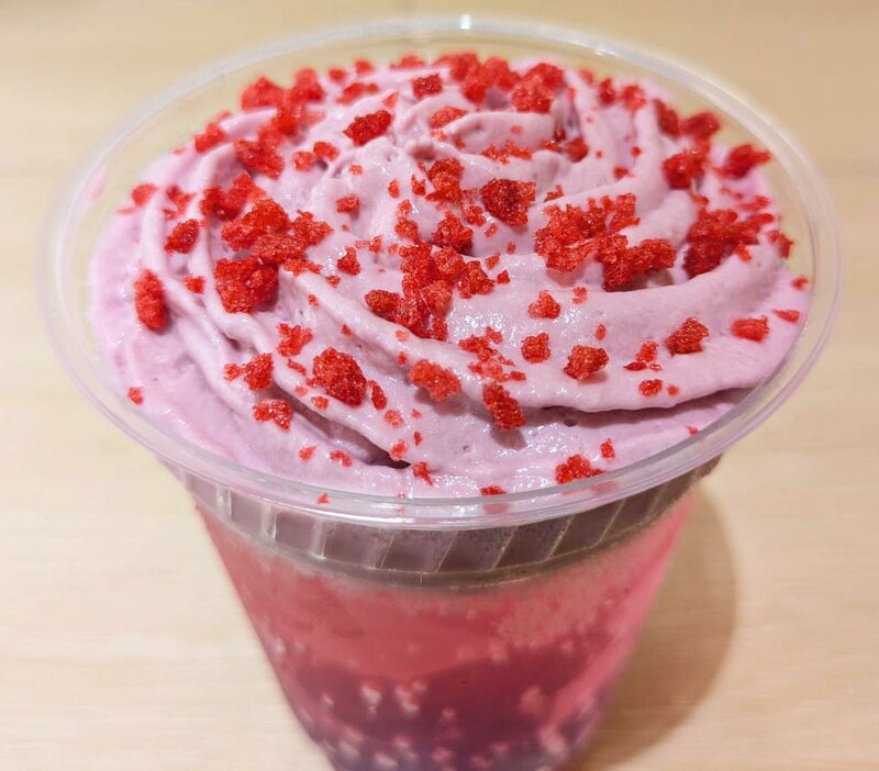 「MANGとCOOKYとKOYOのピーチサイダーゼリー」はフルーティーなピーチソーダに、プルプル食感のサイダーゼリー、ぷどうホイップ、ラズベリー顆粒の組み合わせだよ。かわいいね。かわいいのに530円で安いね。ステッカーついてくるのに安いね。