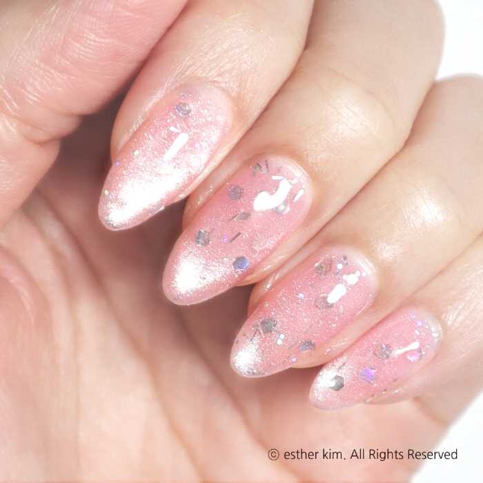 淡いピンクカラーに大粒ホログラムラメがきらめくマグネットカラー。ソーダの泡のように弾けるホログラムは、グラスの中に落ちた恋のしずくをイメージしたロマンティックな仕上がりです。