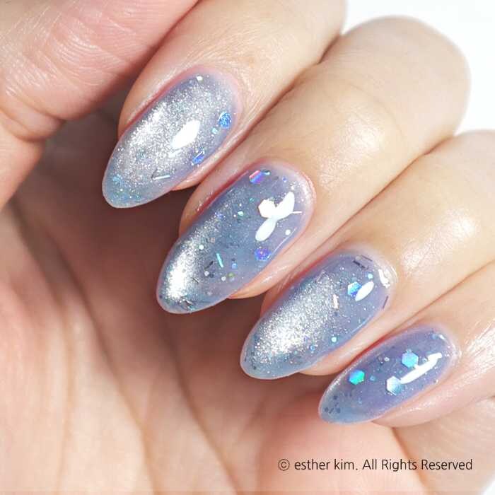 澄んだ薄色ブルーに炭酸の泡のようなホログラムラメを閉じ込めたマグネットカラー。爽やかで涼しげな印象の指先を演出します。