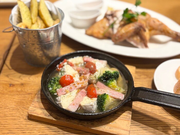 熱々のスキレットで提供するアヒージョ、香ばしいニンニクの風味が食欲をそそります。クリーミーなカマンベールチーズとベーコンの旨みが溶け出したアヒージョはバケットに乗せて食べると思わず笑みが溢れます。