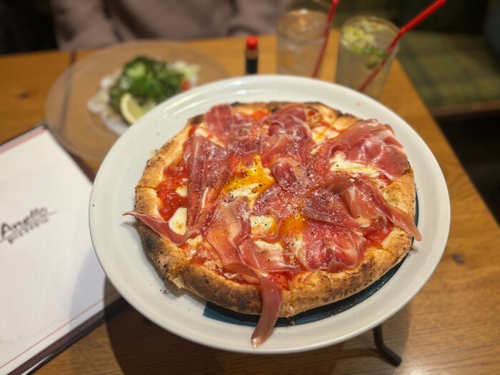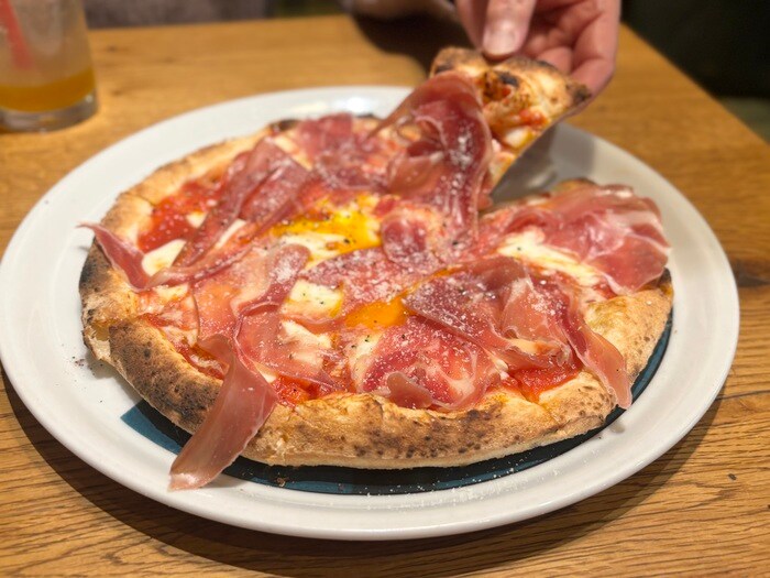 ふっくらと焼かれた生地には、生ハムがふんだんに散らされており、中央にはとろける卵が。噛むと口いっぱいにジュワ〜っと全ての旨みが広がります。旨みと水分をたっぷりと含んだピザは、まるで”飲めるピザ”。