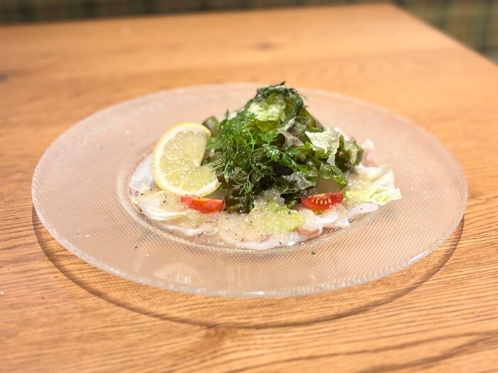 フレッシュなお野菜に、みずみずしい北海道産の生たこが花びらのように円を描くサラダ。生たこにシャキシャキのお野菜を包んでいただきます。白ワインとの相性抜群!