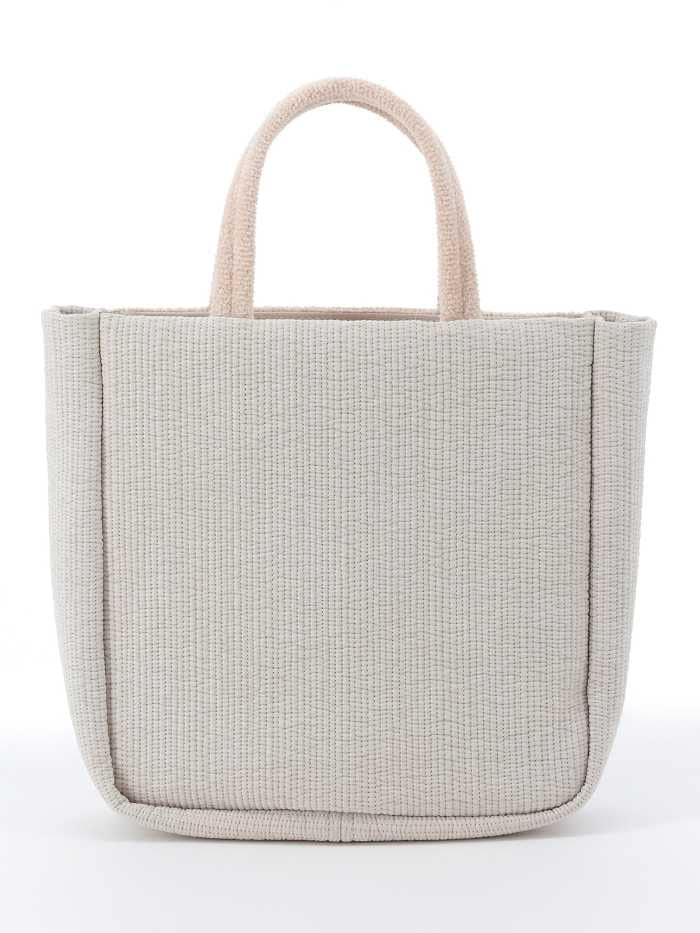 バッグは約21×21×8cm、持ち手上がり9cmで価格は16,500円。カラーはライトグレーとベージュの2色展開です。前面にはシュニール織を使用し、側面や背面には3mmヌビ素材を採用。