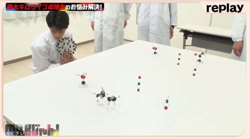 事前に「倒してOKです!」「全然大丈夫!」と言っていた東大生たちだが、想像以上に派手に吹き飛んだ分子模型ピンに大慌てで苦笑い。佐野も、「壊してしまったかも」と言わんばかりに焦った表情になったが、東大生たちから「くっつくので大丈夫です!」と言われると心底安堵し、それでもきちんと「ごめんなさい!」と謝った。