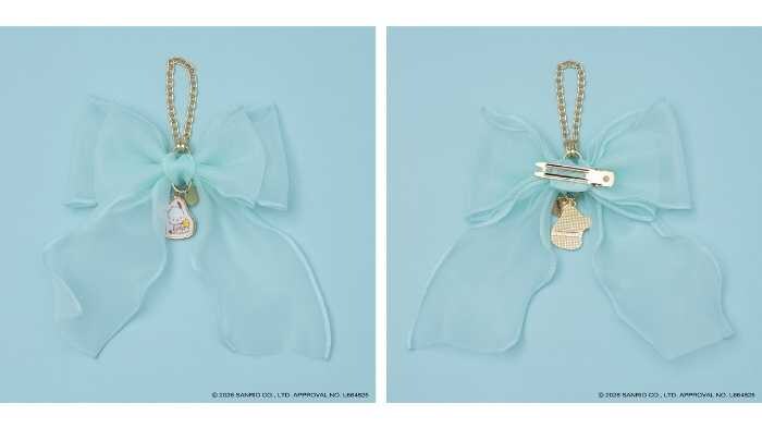 2wayバッグチャームは5,500円。オーガンジーリボンにポチャッコの金具プレートが揺れる可愛らしいデザインです。チェーンは取り外し可能で、ヘアアクセとしても使用できます。