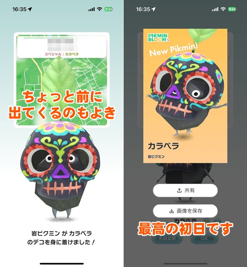 当イベントで入手できる限定デコピクミン“カラベラ”はちょっと怖いけどカラフルでとても個性的だ。