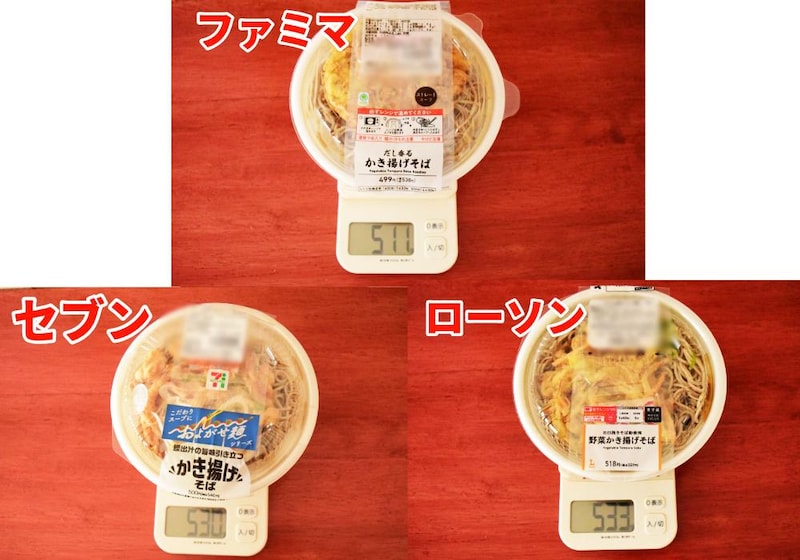 容器も含めて最も重量があるのは、ローソンのかき揚げそばで533g。セブン-イレブンは530g、ファミリーマートは511gとなっています。