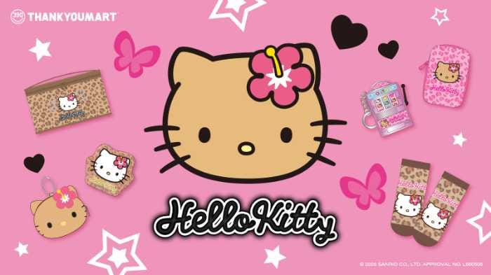 「Be Smile, Be Kawaii」をテーマにしたショップ「サンキューマート」から、「ハローキティ」の平成ギャルモチーフ限定アイテムが登場します。日焼けギャル風のハローキティやヒョウ柄、蝶、星モチーフを取り入れたデザインは、どこか懐かしくて今っぽいかわいさが魅力。全品390円(税込429円)という手に取りやすい価格で、毎日のコーデや持ち物に気軽に取り入れられるアイテムがそろいます♡