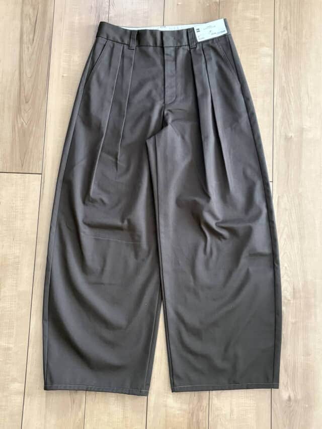 ほどよく厚みのあるチノ素材は肉感を拾いにくく、立体感を保ったまま脚のラインをカバー。丈は引きずらない程度のやや長めが好バランスです。