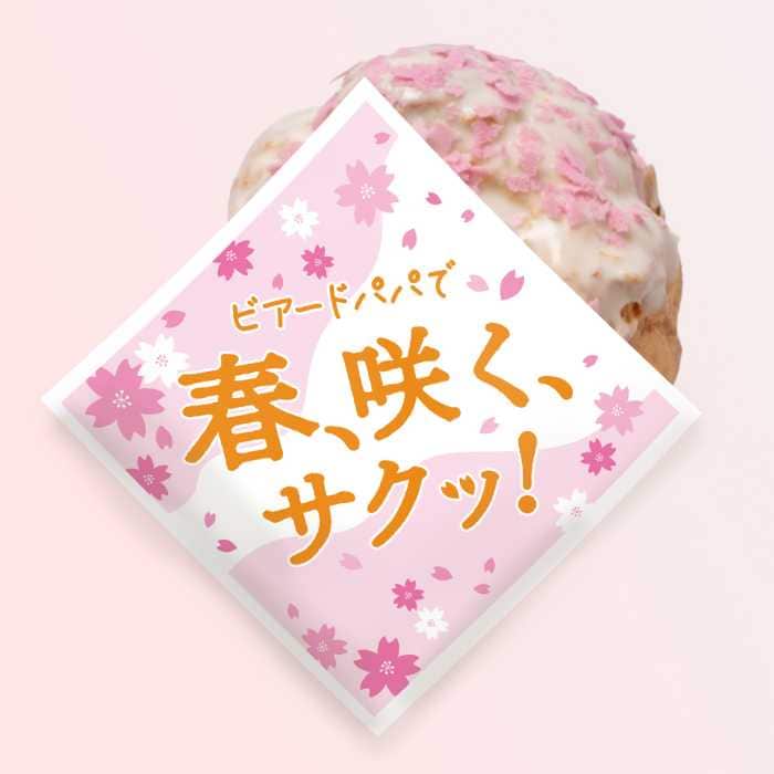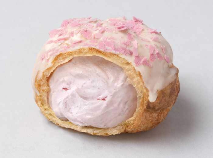 サクサク食感のパイシュー生地をミルキーなホワイトチョコでコーティングし、桜の花びらを思わせる桜色フレークをトッピング。春らしい華やかな見た目が印象的なシュークリームです。