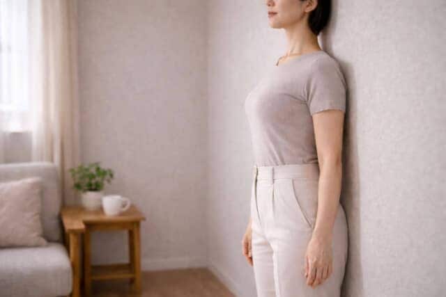 Yさんが取り入れたのは、朝と夜に2〜3分ずつ、壁に後頭部・肩・お尻を軽くつけて立つこと。無理に胸を張るのではなく、骨盤をニュートラルな位置に戻し、下腹をやさしく引き上げる感覚を意識しました。