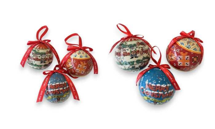 人気のキャンディボールオーナメント(495円/770円・6cm/8cm、プレゼント/サンタ/パーティー)は毎年デザインが変わる注目アイテム。