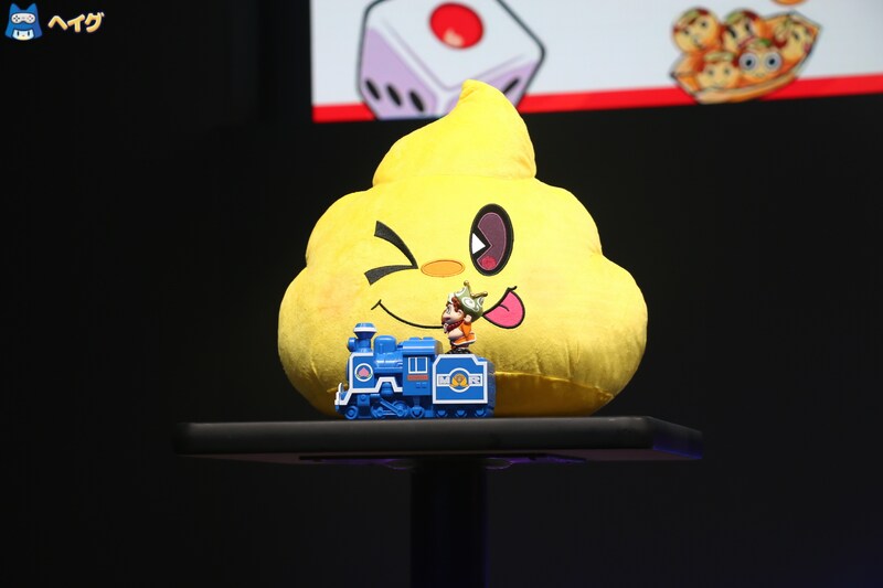 ステージ上では、A賞「目指せ億万長者! 貯金箱」とラストワン賞「うんちがぷよよんぬいぐるみ」が紹介されました。