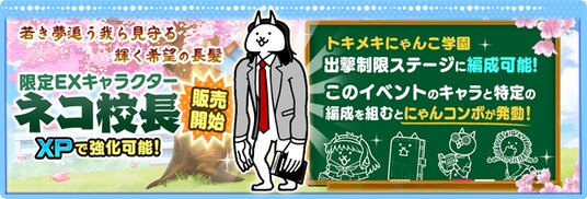 「ネコ校長」はXPでレベルアップが可能で、トキメキにゃんこ学園の出撃制限ステージにも編成可能なので、即戦力になってくれます!
