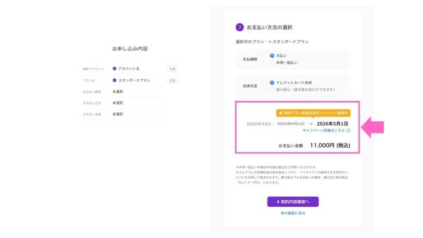 本キャンペーンでは、期間中にスタンダードプランを新規契約された方を対象に、初回支払日を2026年5月1日(金)に設定します。契約日によって無料期間は異なりますが、最大2ヶ月間、スタンダードプランを無料でご利用可能です。