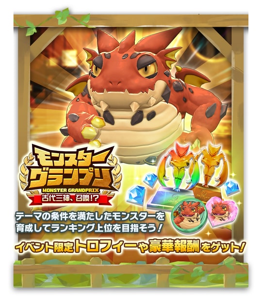 「モンスターグランプリ 『古代三神、召喚!?』」を開催します。前半、後半で3つずつ用意されたテーマに沿ってモンスターを育成完了し、「いいね(総合力を元にしたポイント)」でランキングを競います。月の前半、後半を合算した総合ランキングにより獲得できる専用トロフィーには総合ランキングの順位が保存され、いつでも確認することができます。イベントの詳細はゲーム内にてご確認ください。
