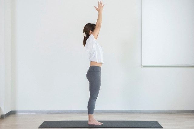 そこで今回は、姿勢を整えながらインナーマッスルを優しく刺激し、自然とお腹が引き締まる感覚を実感できる簡単ポーズ【ウールドゥヴァハスターサナ】を紹介します。立ったまま手を上げるだけなので、スキマ時間にさっとできて、継続しやすいのも嬉しいポイントです。