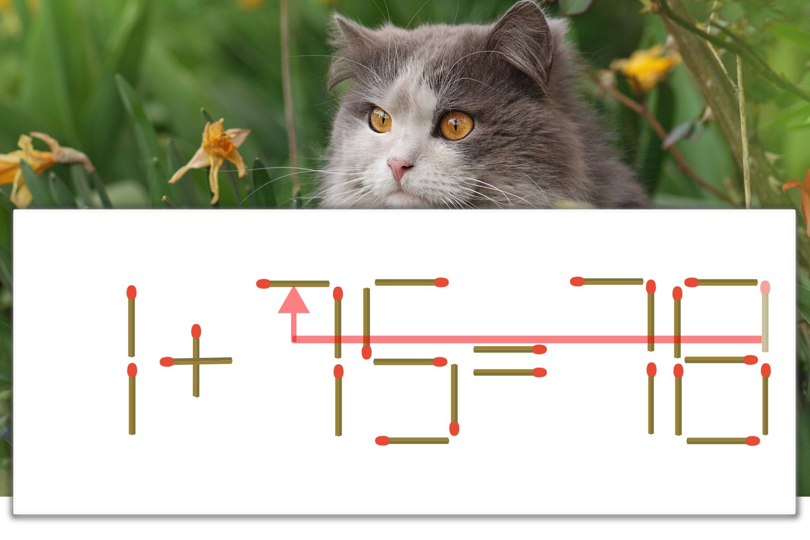 「8」を別の数字に変化させると答えが導き出せます。「8」のマッチ棒を1本移動して、「1」を「7」にしてみましょう。すると、「1+75=76」が成立します。