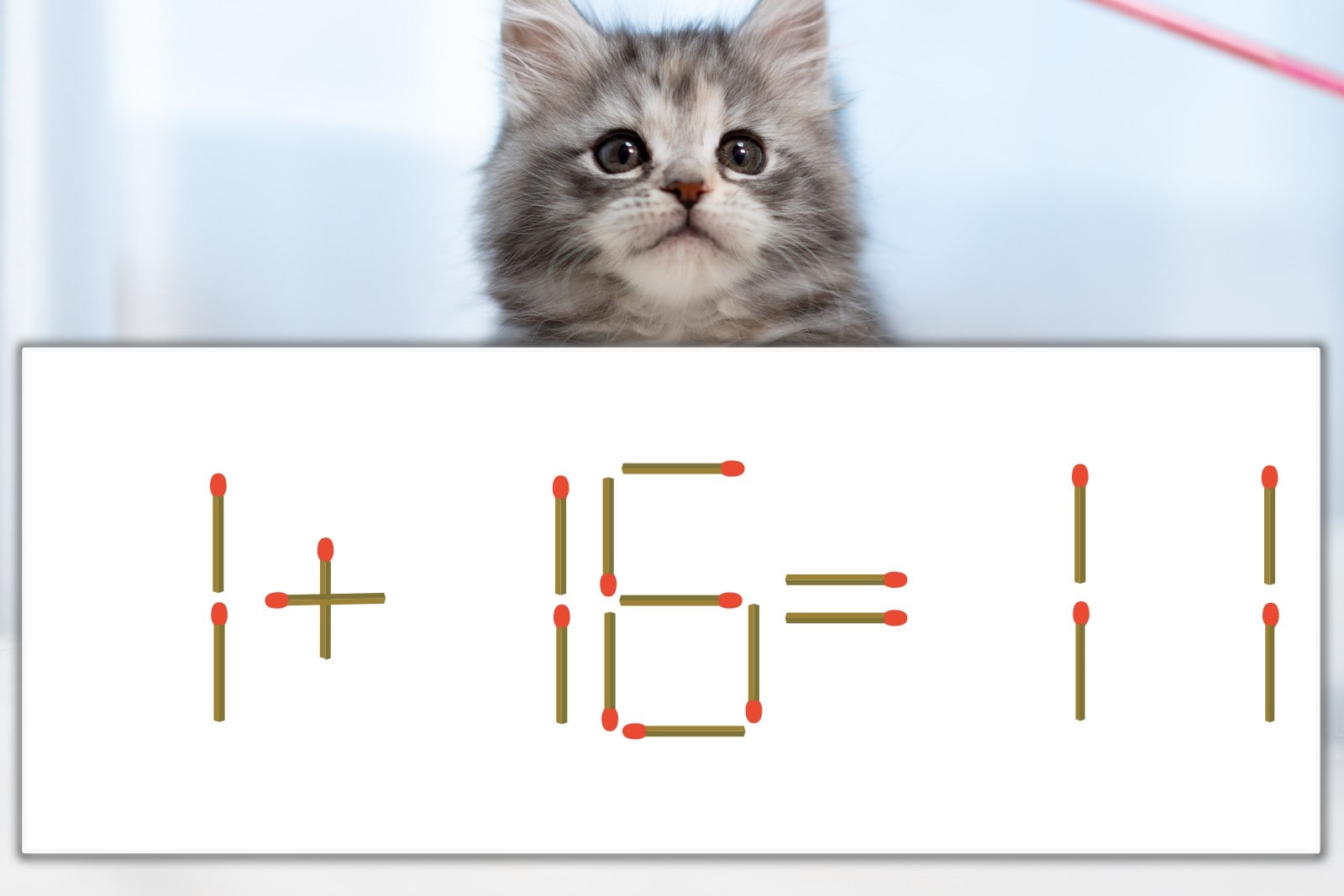 「6」を別の数字に変化させると答えが導き出せます。「6」のマッチ棒を1本移動して、「6」を「0」にしてみましょう。すると、「1+10=11」が成立します。