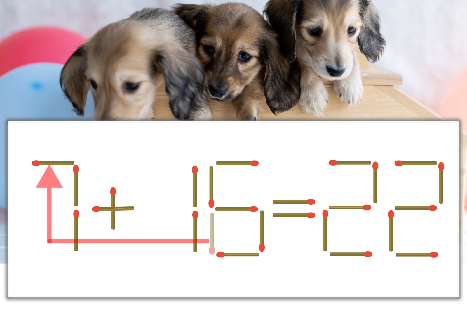 「6」を別の数字に変化させると答えが導き出せます。「6」のマッチ棒を1本移動して、「1」を「7」にしてみましょう。すると、「7+15=22」が成立します。