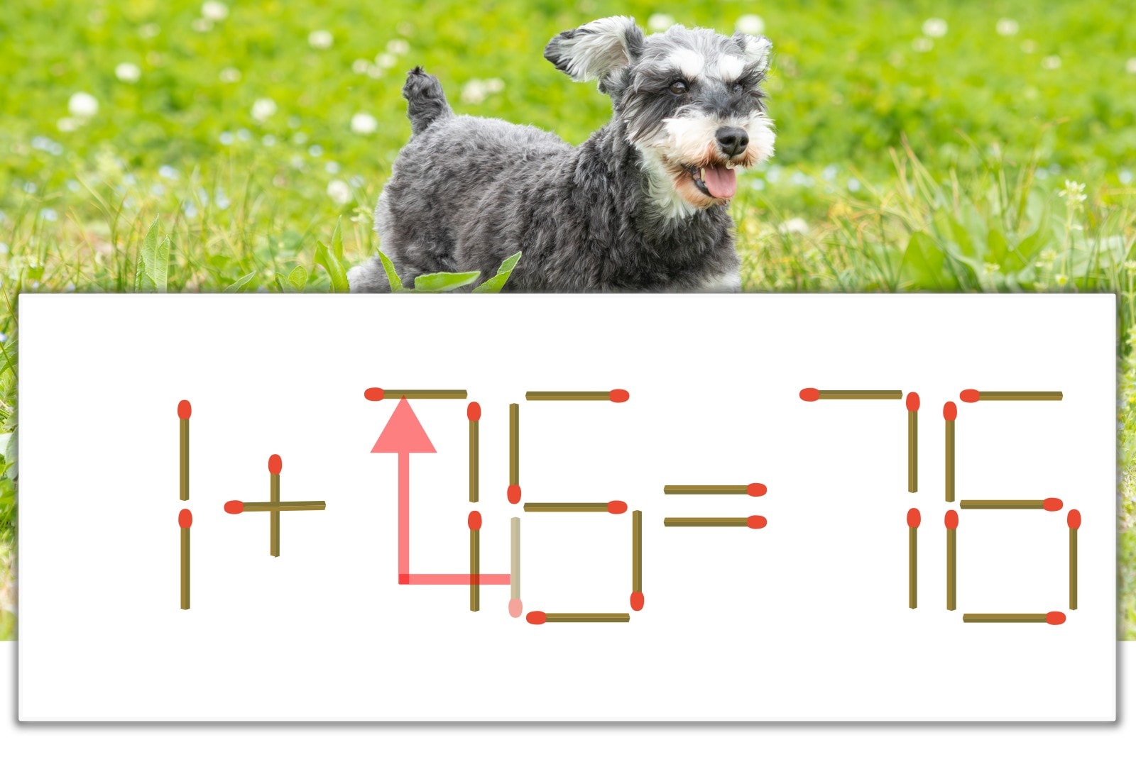 「6」を別の数字に変化させると答えが導き出せます。「6」のマッチ棒を1本移動して、「1」を「7」にしてみましょう。すると、「1+75=76」が成立します。