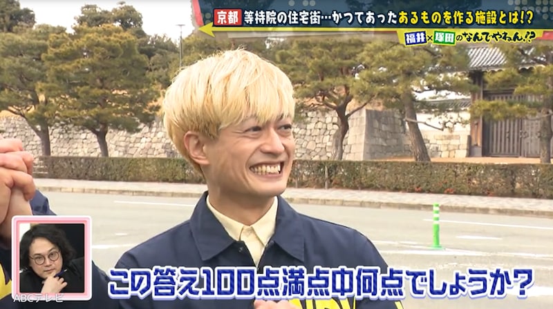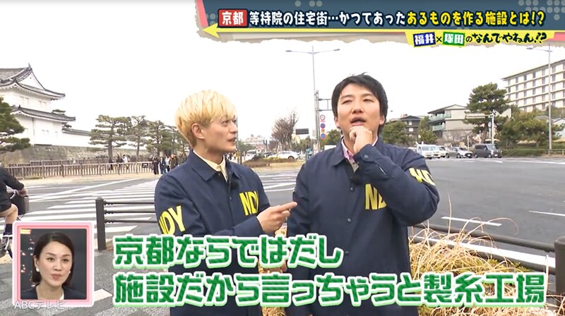塚田と福井アナの予想は正解! 京都のミニツアー・まいまい京都代表の以倉敬之さんいわく、「門の中の住宅街がある場所に、実は昭和7年まであるモノを作る施設があった」「それがやがて閉鎖されて住宅地として払い下げられ、現在の姿になった」とのこと。あるモノとは、「京都ならではのもの」だそうで、以倉さんは世界遺産・元離宮二条城の南側を調べるよう、塚田と福井アナに指示した。
