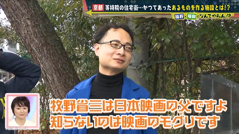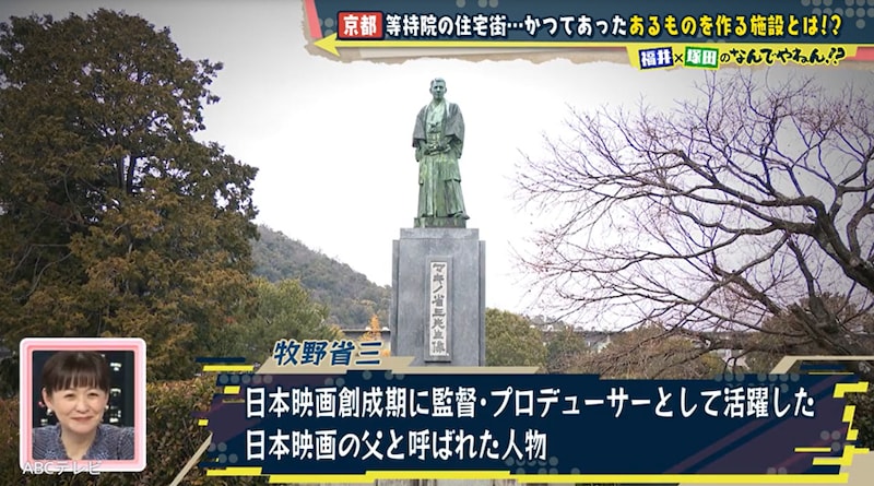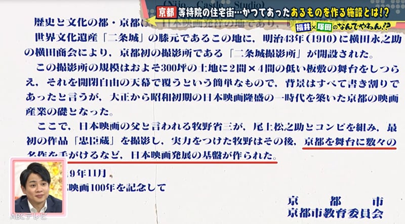 しかしその結果は、100点満点中0点! 塚田と福井アナが見つけるべきだったのは、二条城撮影所跡だ。その説明版には、「日本映画の父と言われる牧野省三」「牧野はその後、京都を舞台に数々の名作を手掛けるなど、日本映画発展の基盤が作られた」という記載が! つまり、等持院敷地内の住宅地の前身施設は、映画の撮影場所だったのだ。