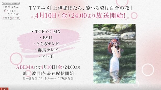 ABEMAが、2026年4月より放送予定の新作TVアニメ『上伊那ぼたん、酔へる姿は百合の花』の“情報解禁特番”『上伊那ぼたんが、お好きでしょ|TVアニメ『上伊那ぼたん、酔へる姿は百合の花』新情報発表特番』を、2月23日に放送した。