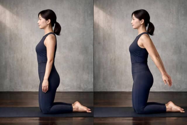 床にひざ立ちになり、脚は腰幅に。背骨を上へ長く伸ばし、お腹を薄く引き込みます。両腕は体の横に下ろし、手のひらを後ろへ向けます。肩が前に入らないよう鎖骨を横に広げ、首を長く保ちましょう。