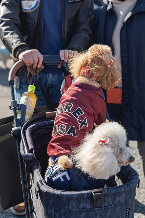 稲フェスは来場者によるアメカジファッションの競演の場でもあるが、実はワンちゃんたちもおしゃれを楽しんでいる。デニムやMA-1などでキメたワンちゃんたちをスナップ!