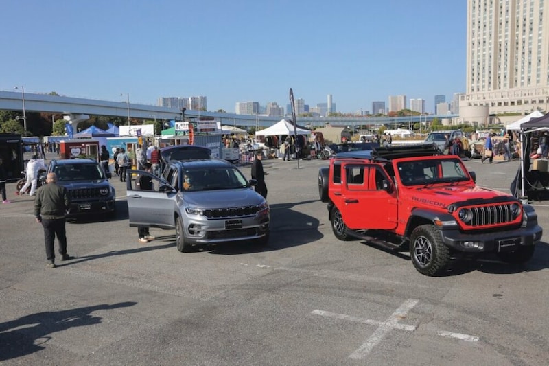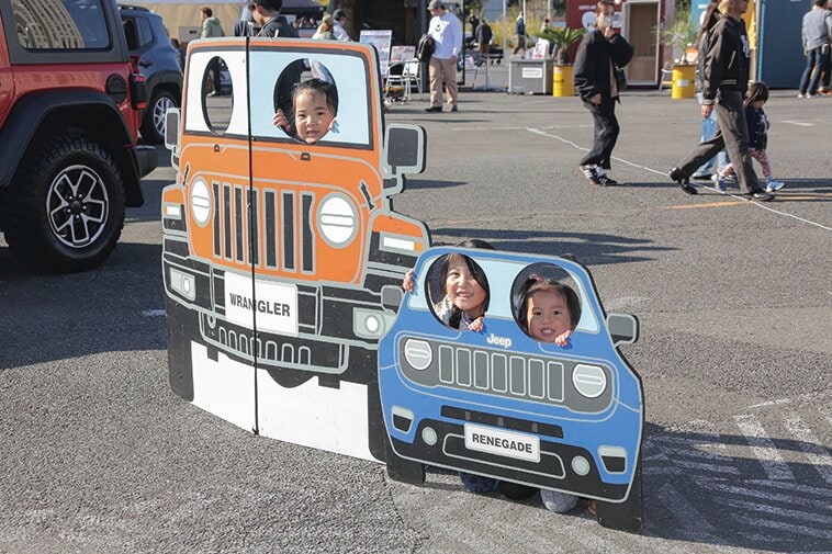 ジープのエリアでは最新モデルを展示。実際に乗り込んで座り心地などを確認したりと大人から子どもまで大人気だった。お馴染みの顔ハメスナップもできたぞ。