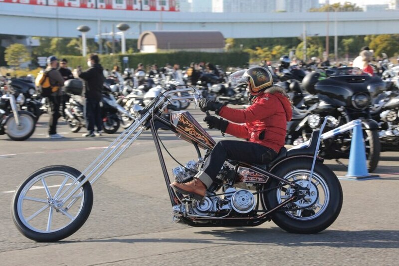 二輪バイクの駐輪場は、カスタムハーレーの競演の場にもなった。軽快なエンジン音を響き渡せながら、会場に入ってくる姿に目が離せない。