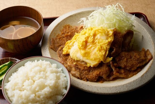 フレッシュな生姜の香りと辛味を活かした秘伝のタレとの相性も抜群で、石川県産ブランド米100%の白米がどんどん進むおいしさです。定食には“特製能登のいしる出汁入り味噌汁”とお漬物、薩摩赤玉の生卵1個が付いて大満足。