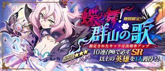 『蝶の舞!群山の歌』は10連召喚で必ずSR以上の英雄を一人獲得できる、期間限定召喚です。SSRフンババの出現確率が期間限定でアップします。