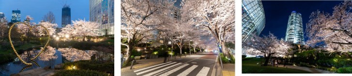 「毛利庭園」と「六本木さくら坂」では、3月下旬~4月中旬頃、夜桜をライトアップ。回遊式の日本庭園「毛利庭園」では、江戸時代のなごりを伝える毛利池や滝のせせらぎなどの自然とともに、夜桜を鑑賞できる。「六本木さくら坂」では、開業時から育てられた74本のソメイヨシノが約400メートルの桜並木を飾る。