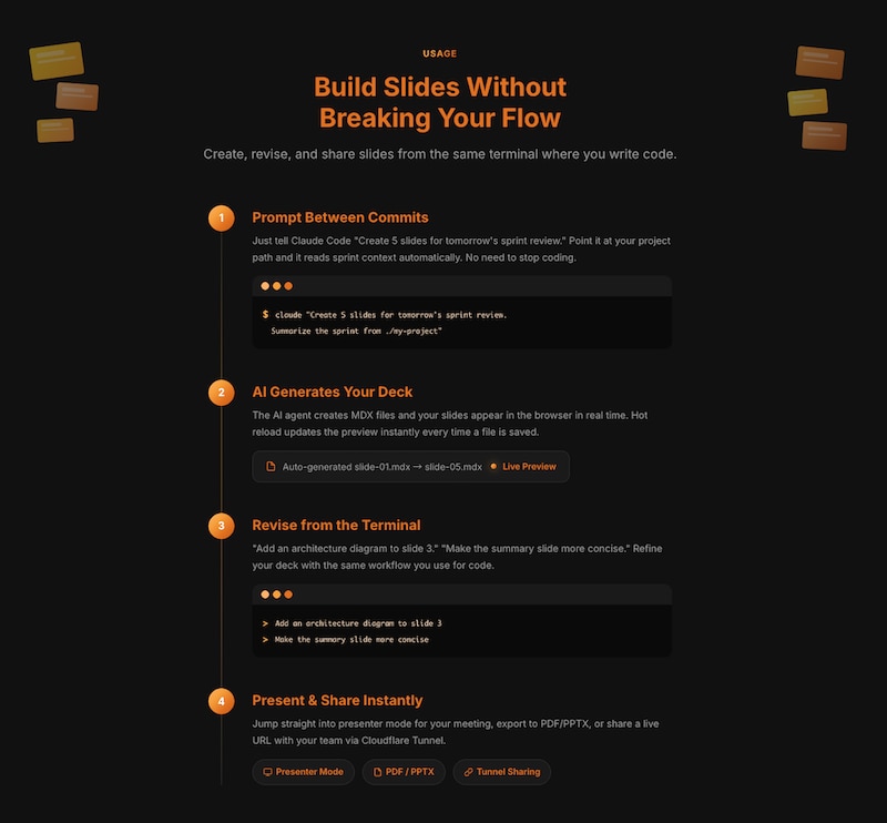 つまり、開発者は今使っているターミナルから一歩も離れることなく、開発の合間にスライドを作り、ブラウザでプレビューしそのまま会議に臨めるのだ。