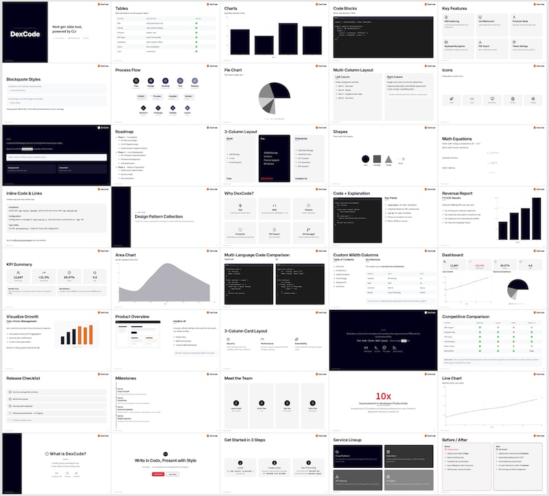 DexCodeはこの環境に着目し、スライドの中身をMDX(Markdown + JSX)で記述する設計にすることで、AIコーディングエージェントがコードを書くのとまったく同じ操作で、スライドの生成・編集ができる仕様。