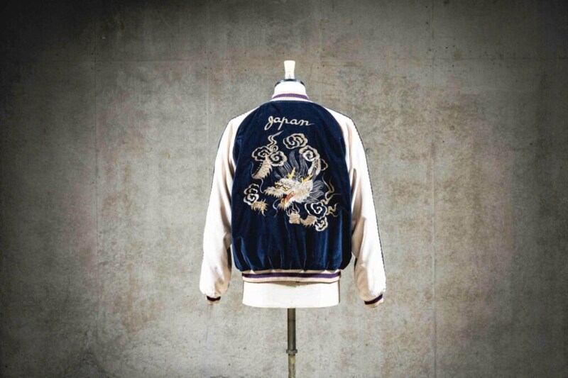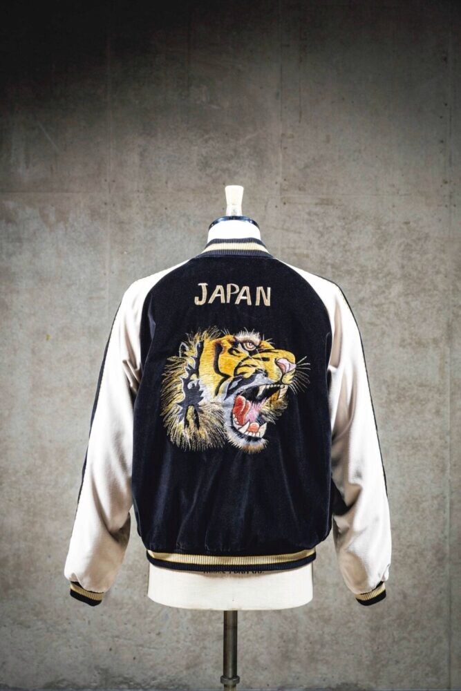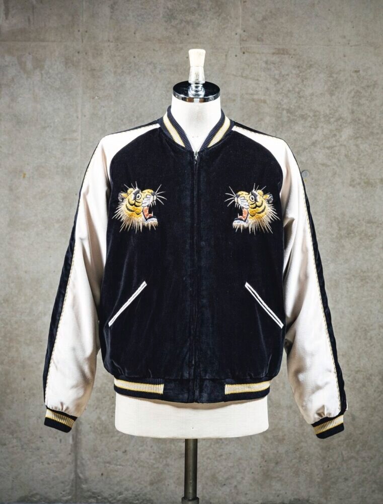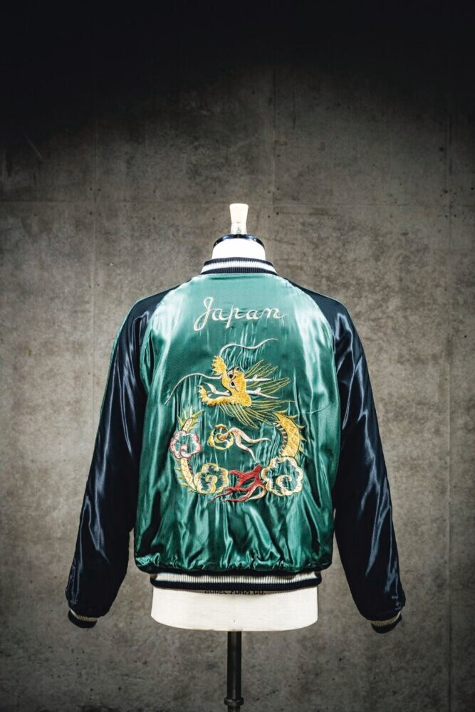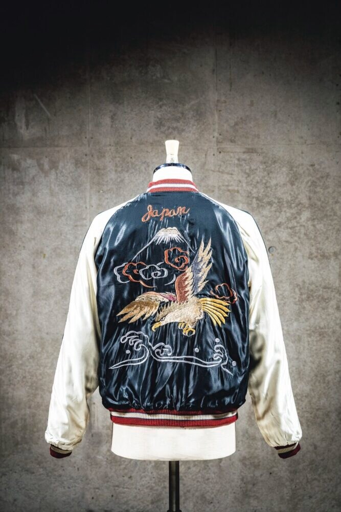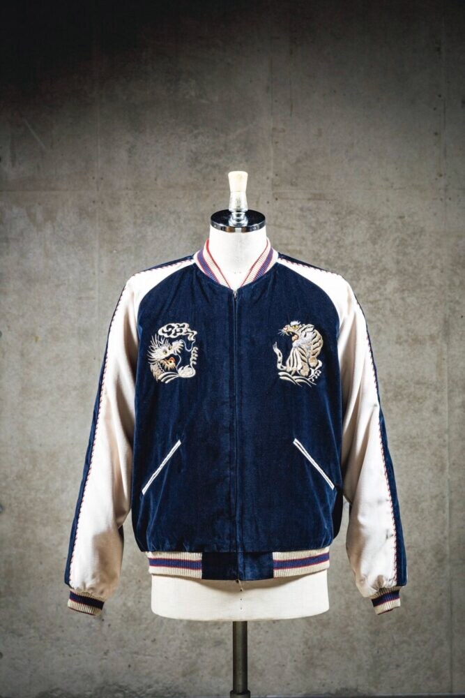 「別珍のスカジャンといえば、基本的に1トーンデザインです。身頃がネイビーなら袖もネイビー、身頃がブラックなら袖もブラックという具合に。これまでに40年近い期間、私がヴィンテージのスカジャンを見てきたなかでも2トーンの別珍スカジャンを目にしたのは2回のみですね。身頃と袖に異なるカラーを配した別珍スカジャンは、ウルトラレアといえるでしょう。また、リバーシブル面に中綿を入れ、キルティングを仕込むのが別珍スカジャンの定番的仕様です。しかし、これまでに私が目にしてきた2トーンの別珍スカジャンは、どちらも中綿がない仕様でした。年代的には1950年代中期から後期のものとなります」