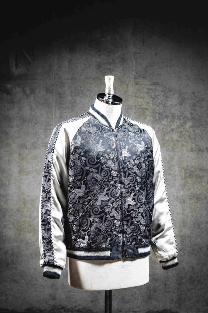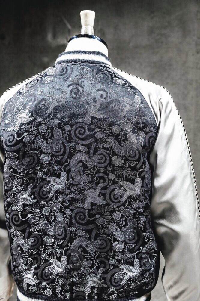 「ブラックの地色に対し、煌めくシルバーの糸で虎と笹、龍と雷雲を織り込んでいます。これらは日本古来のモチーフで、スカジャンにも刺繍されてきました。それが刺繍ではなくて織りで、しかも黒地で、というのが極めて希少といえるポイントです。ヴィンテージ同様のしなやかなレーヨンブロケード生地を完全復刻するために、構想段階から幾度も試作を重ねてようやく完成させることができました。60周年記念に相応しい1着ができたと自負しています」